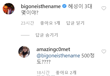 래퍼 빅원이 해당 영상에서 "혜성이 3대 몇이야?"라고 묻자 그는 "500 정도????"라고 답글을 남기기도 했다.