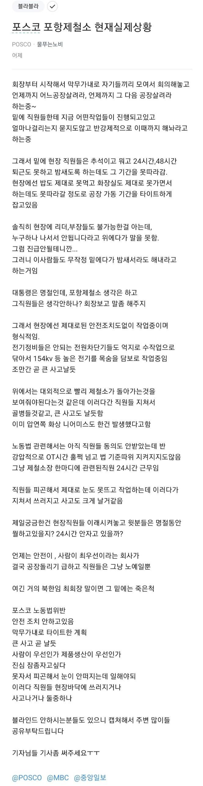 블라인드에 뜬 포항제철소 상황
