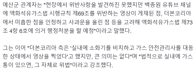 [단독]백종원, '가스통 옆 요리' 해명에도…"그자체로 위법" 과태료 처분
