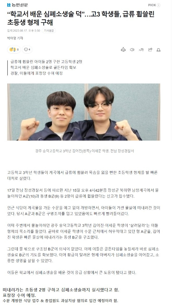 급류 휩쓸린 초등생 형제 구한 고3 2명
