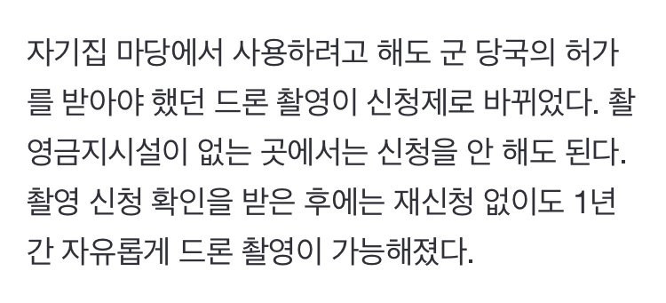 기존에는 항공 촬영에 앞서 허가를 받도록 했던 것을 ‘드론 원스톱 민원서비스’를 통해 항공 촬영을 신청하는 제도로 변경.