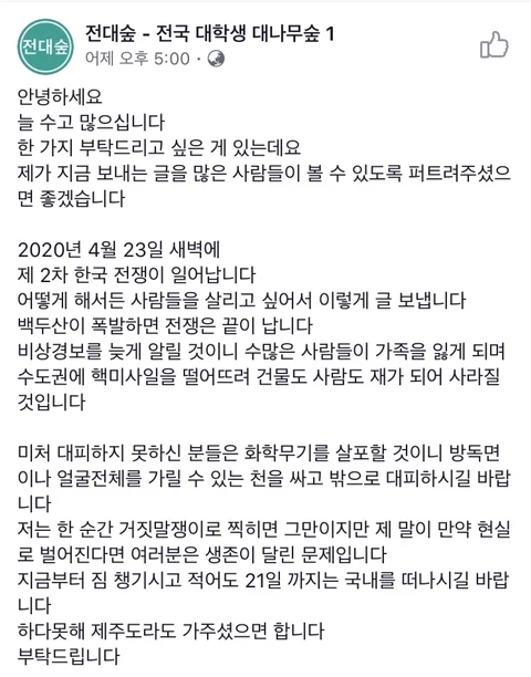 글쓴이는 "2020년 4월 23일 새벽에 제2차 한국 전쟁이 일어난다"며 "어떻게 해서든 사람들을 살리고 싶어 이렇게 글을 보낸다"고 말문을 열었다.